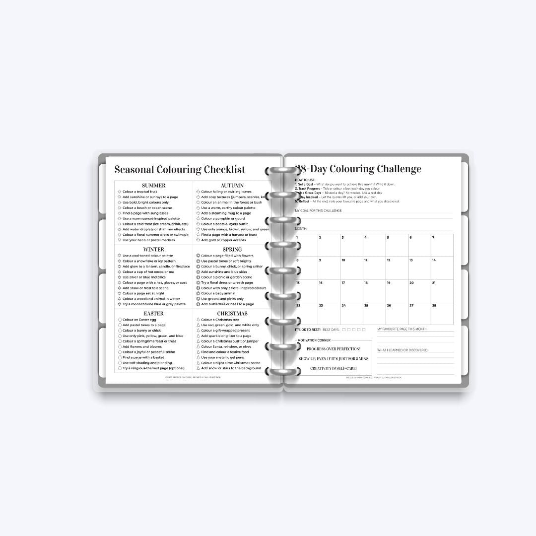 Stuck on what to colour next? Looking for a little motivation or a playful way to stretch your creativity? This 10-page printable pack is your perfect companion. Filled with creative prompts, seasonal checklists, themed challenges, and inspiring activities, this pack is designed to bring joy, variety, and direction to your colouring sessions.